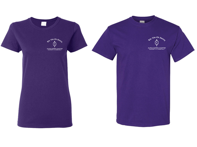 Customize your purple tee shirt with YOUR RHO CHI CHAPTER & SCHOOL NAME under the Rho Chi white logo on the left chest of the tee shirt.
